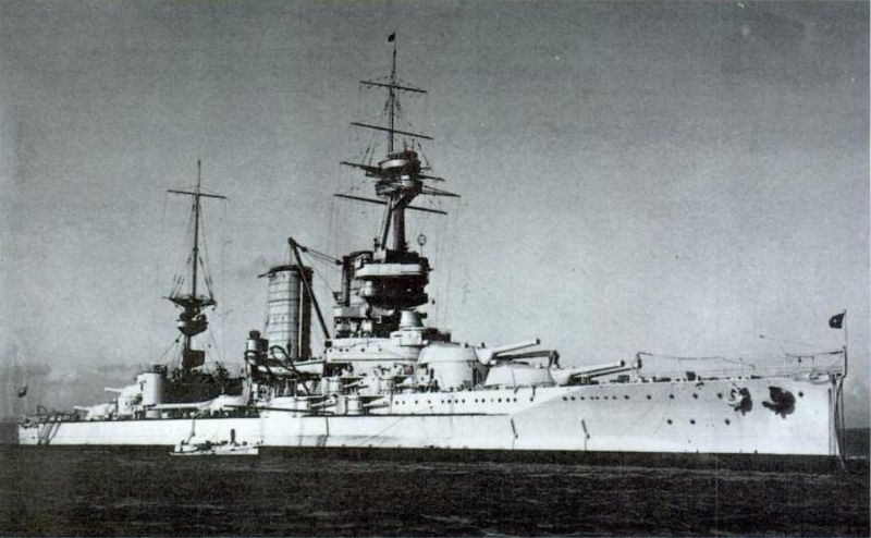 Agincourt later in her career. Note the removal of the boat deck over the central two turrets.