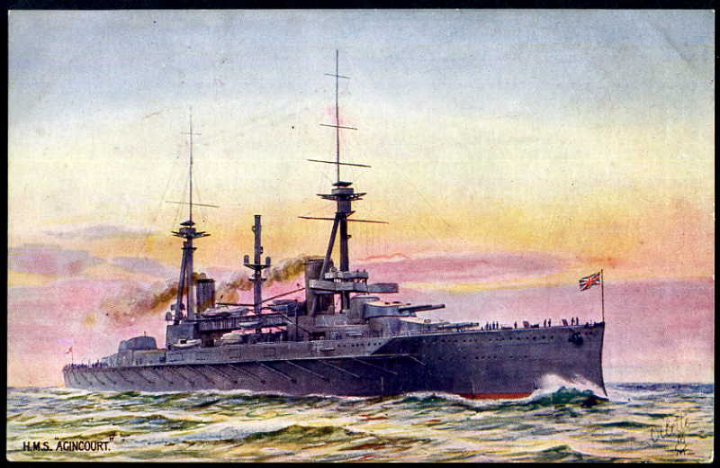 A slowdown in the Brazilian economy in 1913 prompted them to put the ship up for sale, and the Ottoman Empire swooped in to buy the ship to accompany the other battleship they had on order, the Reşadiye. Renamed Sultân Osmân-ı Evvel, the former Rio de Janeiro was completed in August of 1914, just in time to be seized by the British, who were afraid (correctly) that the Ottomas would turn her over to the Germans. She entered RN service as HMS Agincourt four days later. The takeover caused considerable anti-British feeling in the Ottoman Empire, as the ship had been purchased by a public subscription campaign.