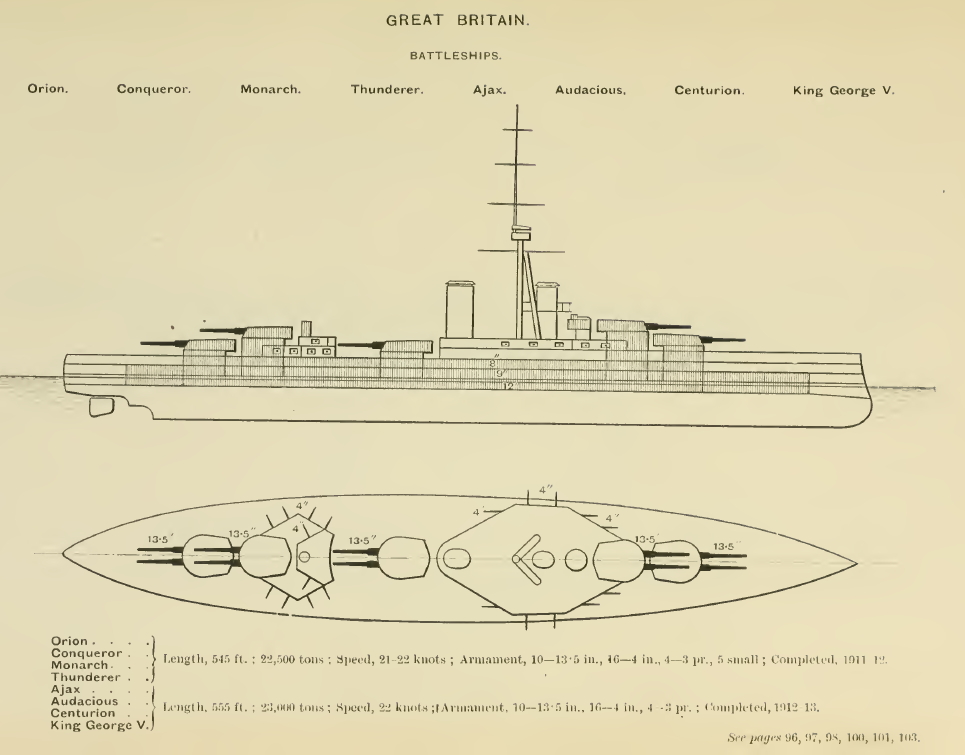The four Orion class battleships were the result of the famous 1909-1910 program, when the British became convinced that the Germans were planning a major building campaign to overtake them at sea.1 Instead of the normal three-ship programs of the era, four ships were bought initially, the two ships of the Colossus class, the battlecruiser Lion, and Orion. Later, under public pressure, another three units of the class were ordered, as well as the battlecruiser Princess Royal.