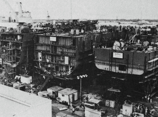 Hull sections of USS Yorktown, second ship of the class, at Ingalls Shipbuilding in Pascagoula, Mississippi