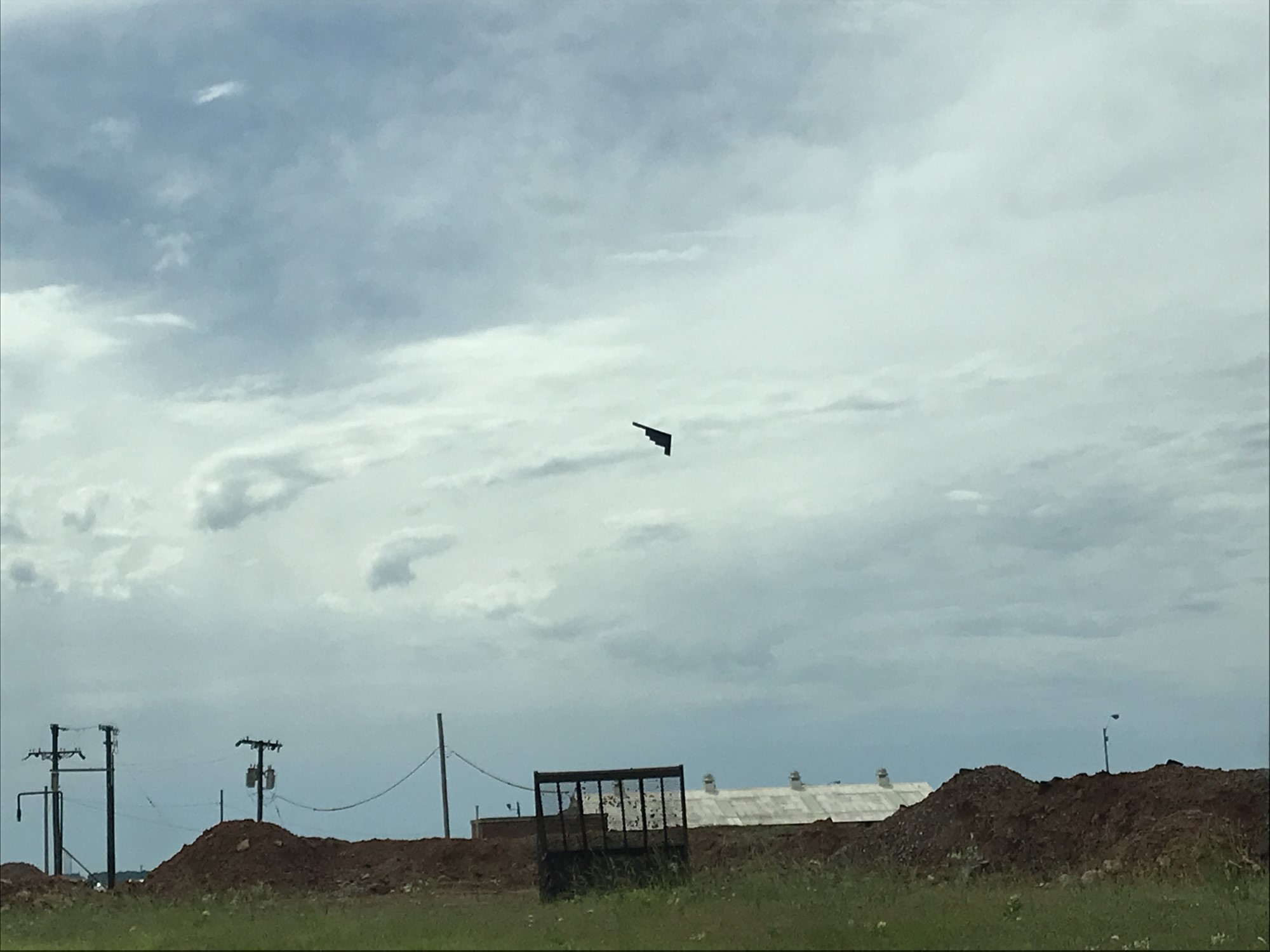But as 2:00 approached, things began to get interesting as the northwestern horizon darkened.2 They suspended the show, and suggested that everyone seek shelter. I'd hooked up with a friend from church who worked at Tinker, so we planned to just go to his office, which would be more comfortable than the crowded hangars. Thanks to a series of mishaps that I'm not going to go into, we stayed in place too long, and were still heading for shelter when we saw a dust devil heading for us. The result was chaos. Kids were screaming about a tornado, and the wind was brutal. I was afraid I was going to lose my hat, and then have to abandon it because we really needed to get to shelter. But we made it before the rain started, and eventually ended up as quite possibly the most comfortable spectators on base.