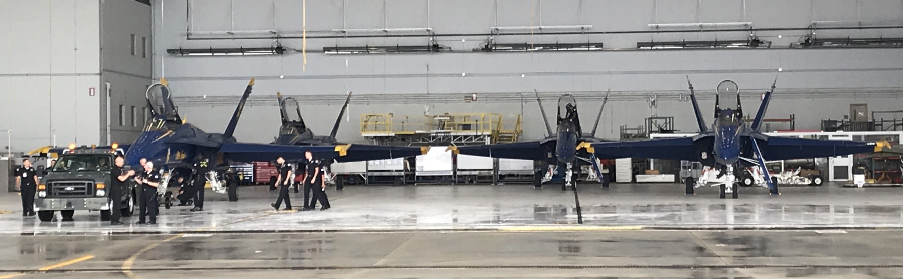 As we reached the car, we heard a fighter jet scream overhead. It was an F-16, flying a fairly typical demo, and because we weren't in the normal viewing area, we got a very different show than most of the spectators. A lot of the maneuvers weren't visible, but we got a couple of great views as it turned around above us. We'd decided to watch the Blue Angels (if they flew) from the east side of the base, opposite the main viewing area. They finally got into the air around 4:00, and our view of the show was again rather different from what we would have gotten if we'd stayed. Unfortunately, there was a low ridge between us and the performance, which meant that our only view of several of the maneuvers was through gaps in the buildings and cars. On the other hand, we did get good views of most of the higher maneuvers, and they would often fly over us as they returned for another maneuver. The highlight was at the very end of the performance, as they broke to land, one of the airplanes flew over us at no more than a couple hundred feet. It was great, and the Blue Angels turned in their usual spectacular performance.