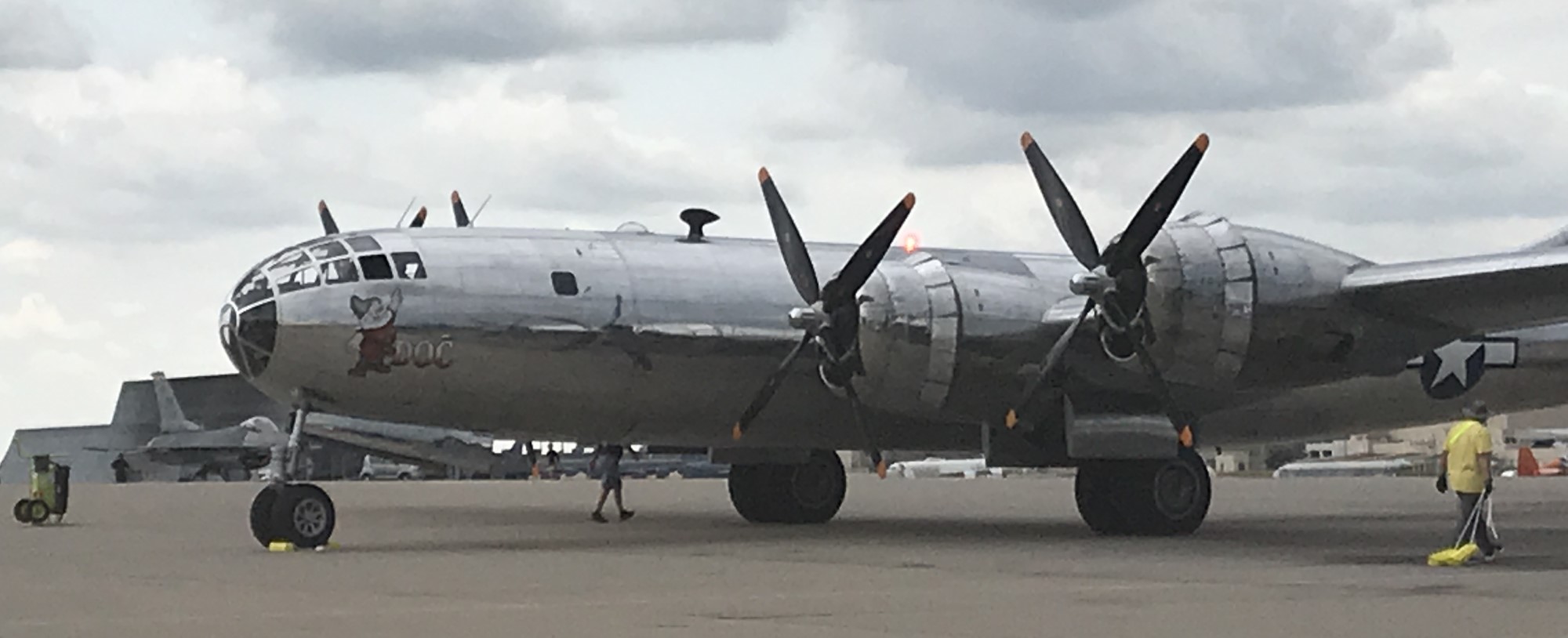 The flying itself was fairly typical of this kind of airshow. For the first time I can remember at an airshow, Sean D. Tucker didn't perform, but there were a couple of acrobatic acts, the best of which was a great comedy performance by Kent Pietsch in the Jelly Belly Interstate Cadet as a man who didn't know how to fly. It's not an original idea, but he executed it really well, including doing a ribbon cut on a "roll of toilet paper" that he'd thrown out. There was also a very cool Vietnam War CSAR demo, with a couple of A-1 Skyraiders, a Huey, a T-37 Tweet and a bunch of pyrotechnics. There was also a demo from three 707 variants that operate out of Tinker, the Navy E-6 Mercury, the KC-135 tanker, and the E-3 AWACS, which is desperately in need of new engines, particularly when one flies over my house. Another highlight was the appearance of "Doc", one of only two flyable B-29s in the world. She looked gorgeous, and sounded amazing.