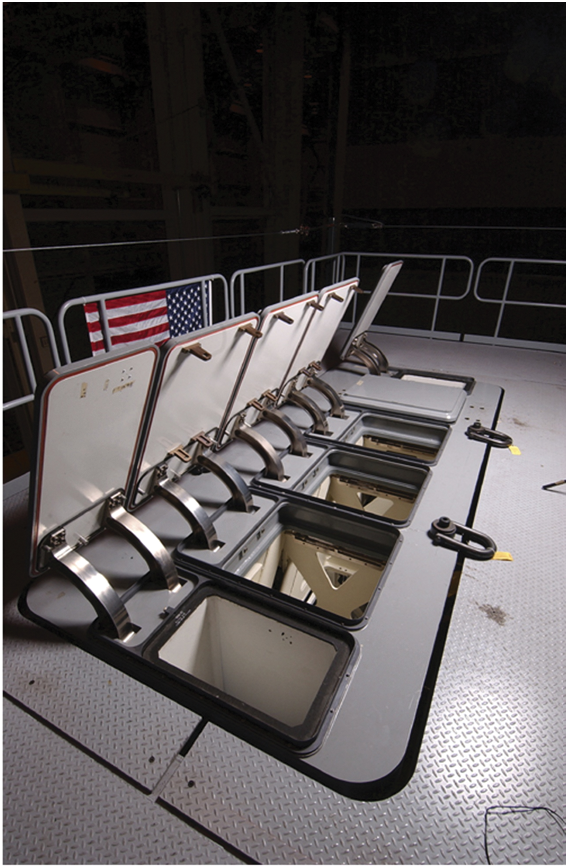 Nor did the armament problems stop there. The Zumwalts were originally intended to have a pair of Mk 110 57 mm guns, as used on the LCS, as secondary armament. However, analysis in 2012 led the Navy to discard these and replace them with much smaller and lighter 30 mm guns, which it was claimed were significantly more effective. At least the 80-cell VLS works reasonably well, although the new ships use a new Mk 57 module scattered around the edges of the deck, instead of the central nest of Mk 41s used on the Burkes and Ticos. These have somewhat larger cells than the Mk 41, and are able to handle significantly higher exhaust flows, but these capabilities are unlikely to be used for a long time, given the number of Mk 41s in the fleet. So far, the missile fit seems to be limited to Tomahawk, Standard and ESSM, with no reported capability to handle VL-ASROC.4 The hangar built into the superstructure can accommodate two SH/MH-60 helicopters. Underneath the flight deck is the internal hangar for the ship's boats, which are deployed through a door in the stern. The sonar suite is optimized for shallow-water ASW and mine avoidance and like so many other systems is unique to the Zumwalts.