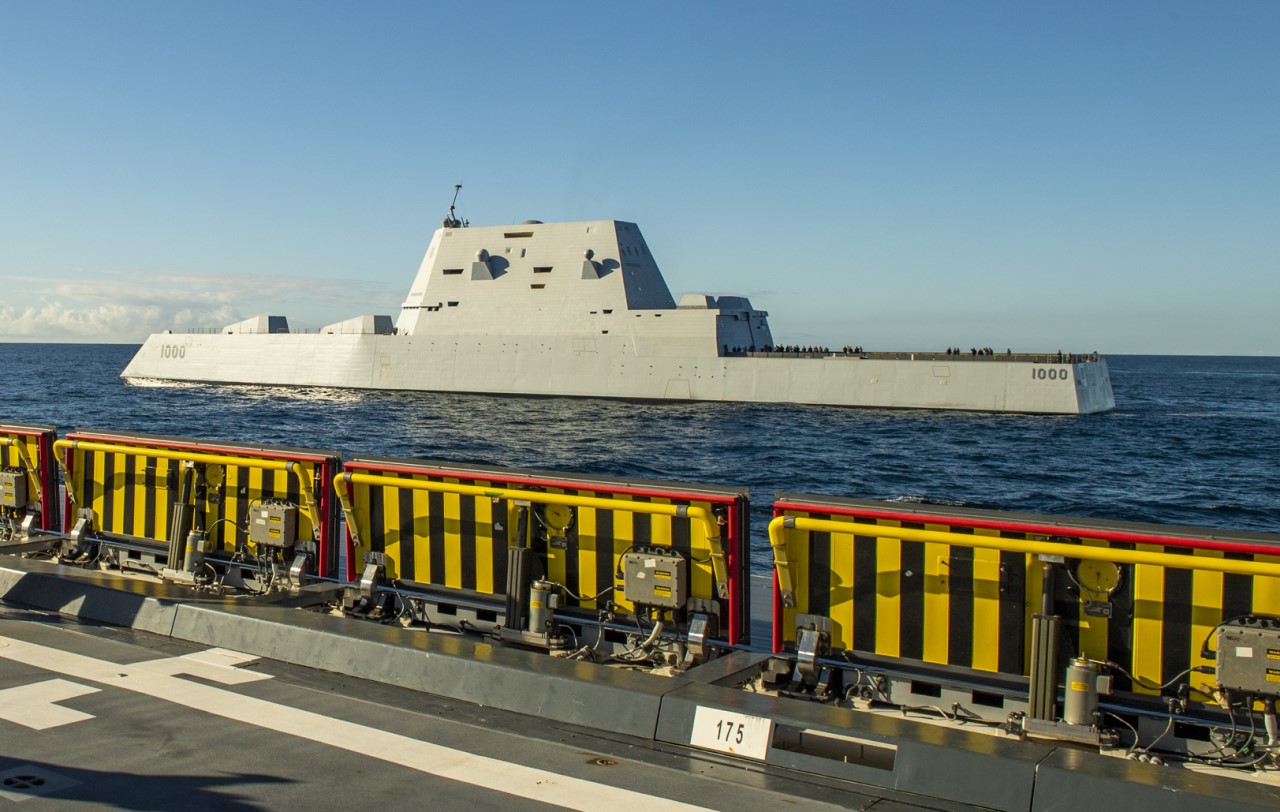 Zumwalt from Monsoor. Note the railings, which are retractable for reduced RCS