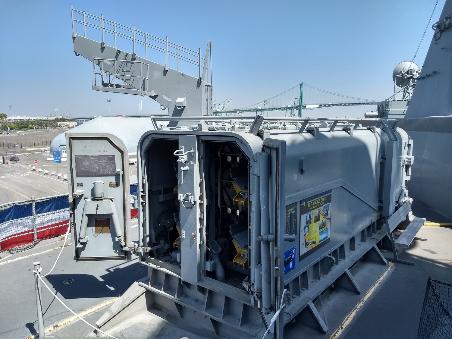 The vast majority of surface ship Tomahawks are also launched vertically, using the Mk 41 Vertical Launching System that equips all modern American cruisers and destroyers. The Mk 41 provides unmatched versatility, allowing tradeoffs to be made between land-attack missions, air-defense in the form of Standard and ESSM, and anti-submarine warfare with VLASROC. But VLS didn't go to sea until the late 80s, so another means was needed to give surface ships an interim capability with Tomahawk. Initial plans were for an open rack similar to that used for Harpoon, but the 1975 fire on the cruiser Belknap increased interest in damage resistance, and an Armored Box Launcher (ABL) was developed. It would protect a quartet of horizontally-stored missiles with an inch or so of armor, then open up for launch. The first weapons would go to sea on the destroyer Merrill, which carried two ABLs, followed by the battleship New Jersey, which was fitted with eight when she was reactivated in the 1980s. Her three sisters were also fitted with a heavy Tomahawk battery, and these weapons formed an important part of the rationale for their last stint in service.