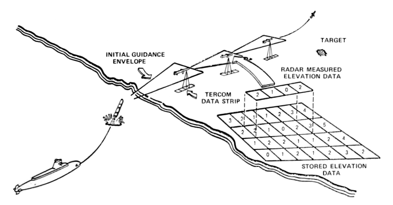 The TLAM-N was equipped with a W80 nuclear warhead, which has an adjustable yield of either 5 kt or 150 kt.2 After launch, it was inertially guided until it made landfall, where the inertial system was updated by a system called Terrain Contour Matching or TERCOM. This involved a series of digitized elevation maps of specific areas along the missile's trajectory. A radar altimeter would read the ground below the missile, and use this data to figure out where in the terrain map it was. The first maps had large cells, to make it easy for the missile to locate itself, and later ones strung along the flightpath were smaller, giving greater accuracy, with the CEP3 estimated at 50m even at the missile's maximum range of 1,350 nm.