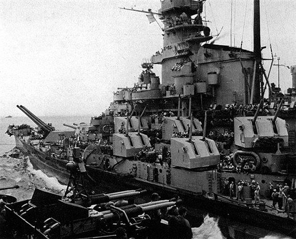 Where the fast battleships really shone was in providing anti-air firepower to carrier groups. The 5” guns were excellent heavy AA weapons, and battleships had the size and stability to accept large numbers of light AA guns. The design armaments of 4 quad 1.1” guns grew to as many as 20 quad 40mm Bofors mounts and 50 20mm Oerlikons. The extra men required, up to 55% extra over the original compliment in the case of Missouri, made the ships very crowded, and the mounts themselves required that main gun arcs be limited to avoid blast damage. The Iowas were particularly effective, as they were the only battleships capable of keeping up with the carriers at full speed, and their size gave slightly better positions for the guns than was possible on the smaller battleships.