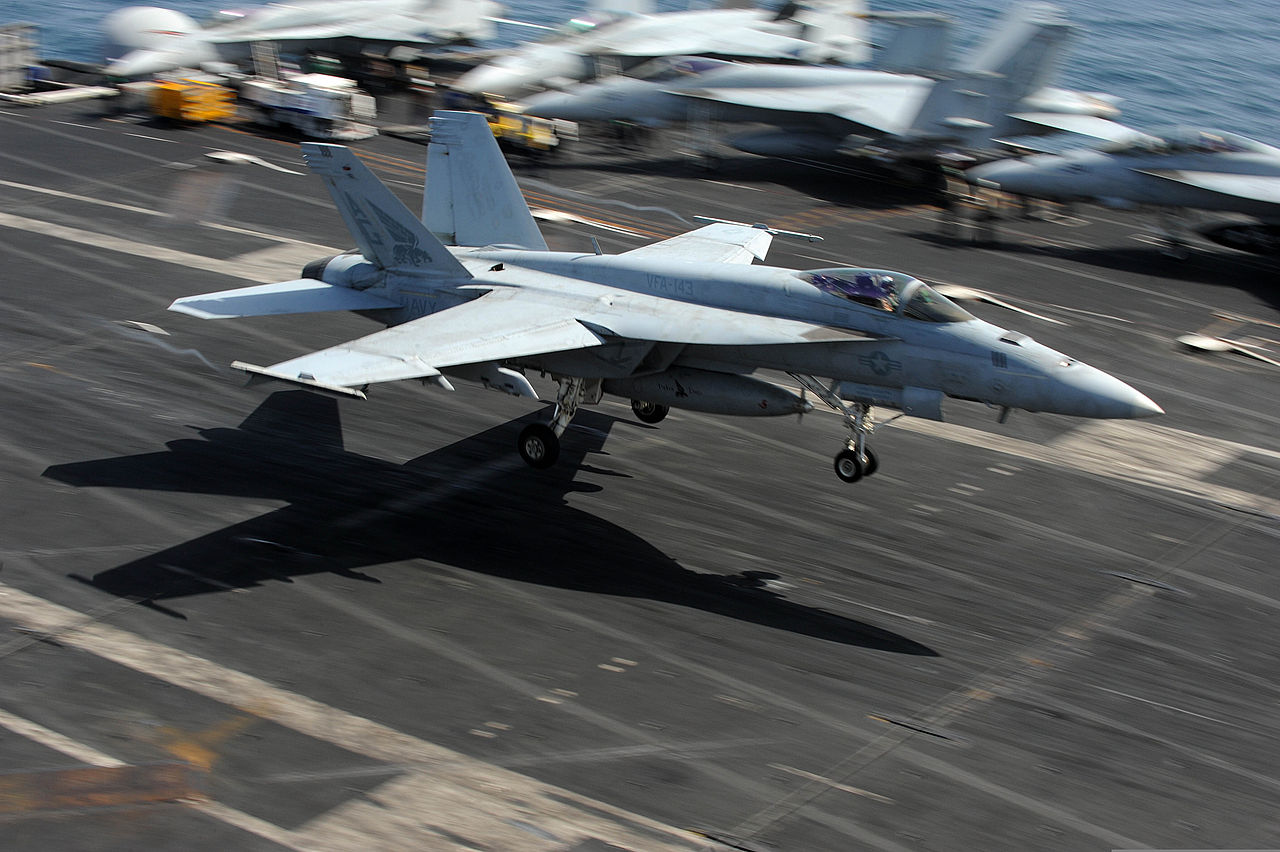The Navy's answer to the F-16, but with two engines instead of one and somewhat better range. The rather unusual designation is the result of combining the planned F-18 and A-18, thanks to improved computers which allowed a single airframe to perform both missions. It's now in the twilight of its career, as the USN has replaced it with the Super Hornet (see below), but it soldiers on with the Marines for the next few years in a few squadrons before being replaced by F-35Cs. Designed to fly from carriers, it was bought by 8 foreign countries for use from land bases, too, although many are also looking to replace it in the next few years.