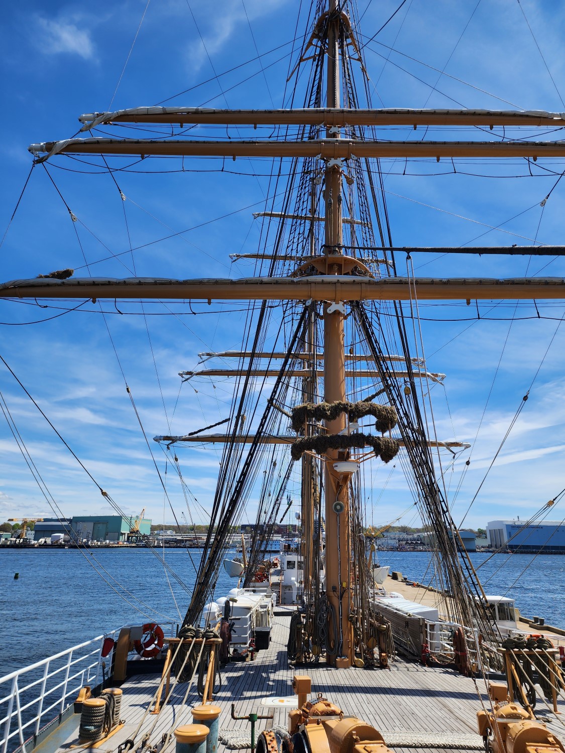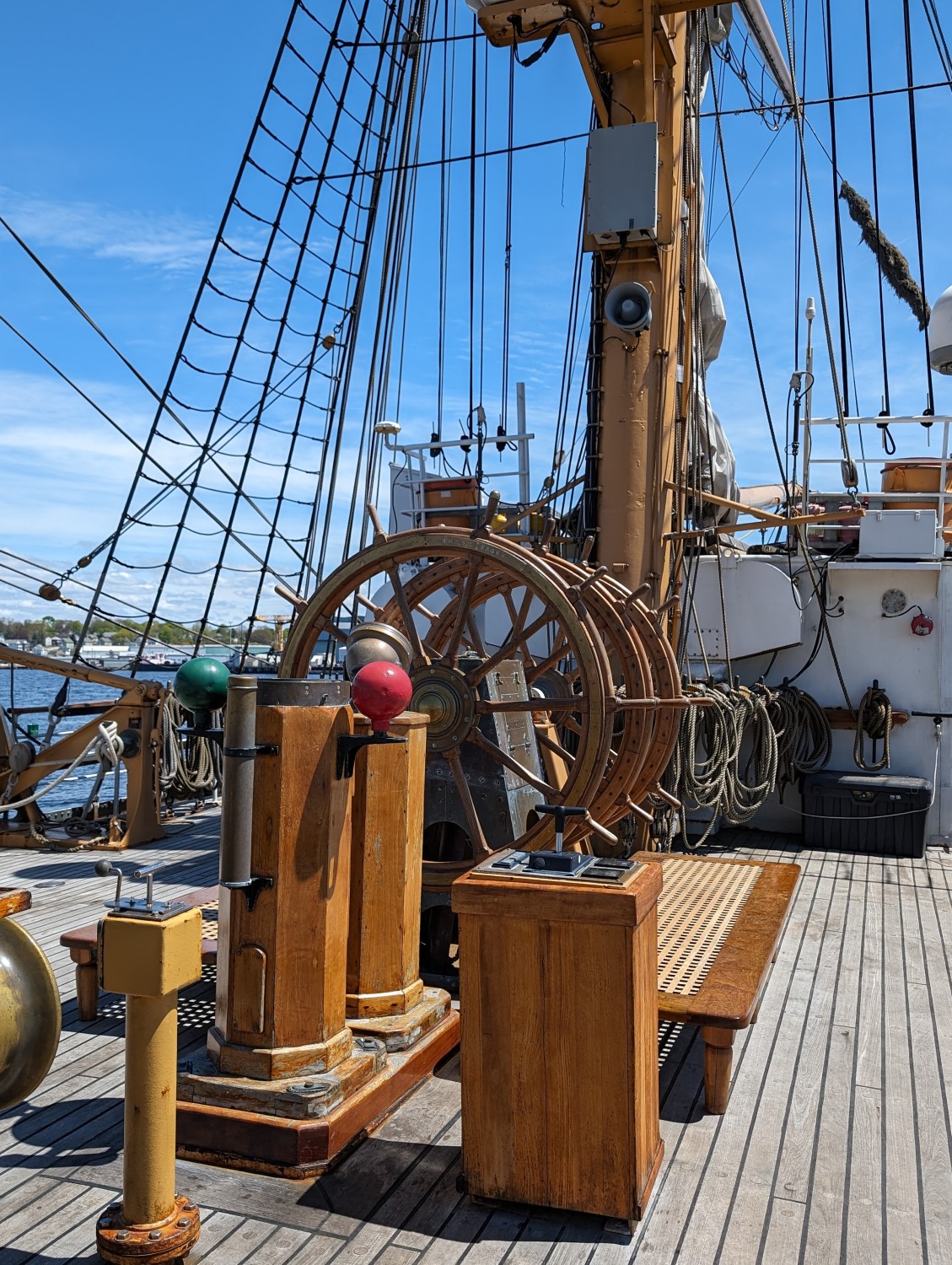 While at the 2024 Naval Gazing meetup, we had the rare and unexpected opportunity to go aboard Eagle. We had gone to Fort Trumbull in New London for lunch as part of my continued quest for a look inside a Third System fort. Unfortunately, it was closed, but we were able to wander the fort's grounds, and as we rounded the front, we saw three masts. I realized that they were in the direction of the Coast Guard station I'd seen on the map, and took off running. My suspicions were confirmed, and even more astonishingly, they were happy to let us go aboard and wander the weather deck. Eagle was smaller than I expected,7 but in lovely shape. She's a mix of the modern (radars and winches) and historical (the helm has three wheels, to allow more sailors to help steer in bad weather). Obviously, there was no signage, but the group had enough knowledge to be able to discuss what we were looking at, and it was extremely cool to walk the decks of such a legendary vessel.