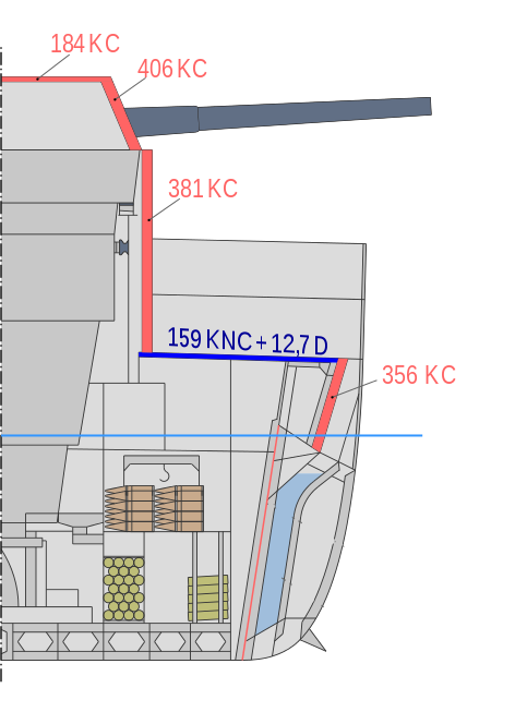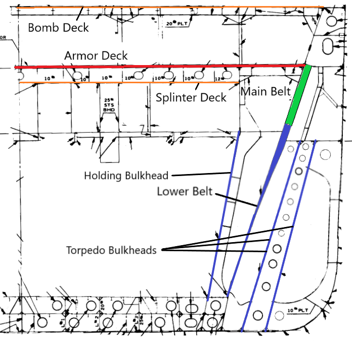 The Japanese went even further, giving equal weight to underwater shell hits and torpedoes. For reasons that are not entirely clear, they ignored the use of liquid layers entirely, apparently believing that the thick lower belt was adequate compensation. This was not the case, and to make matters worse, the joint between the upper and lower belts was designed improperly, with incorrect scaling from the model tests. It relied entirely on the shear strength of rivets, which failed under relatively light torpedo hits on Yamato, Musashi and Shinano, ultimately leading to the loss of all three ships.